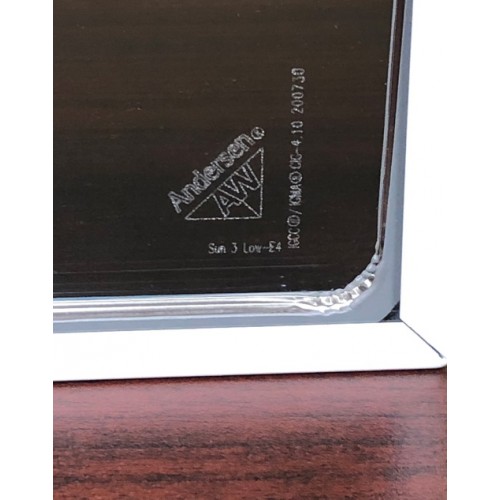 Renewal by Andersen® window sample with stainless steel spacer and the Andersen® bug stamped in the bottom corner. 7” x 7” sample wrapped in white frame.