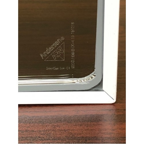 Renewal by Andersen® window sample with stainless steel spacer and the Andersen® bug stamped in the bottom corner. 7” x 7” sample wrapped in white frame.