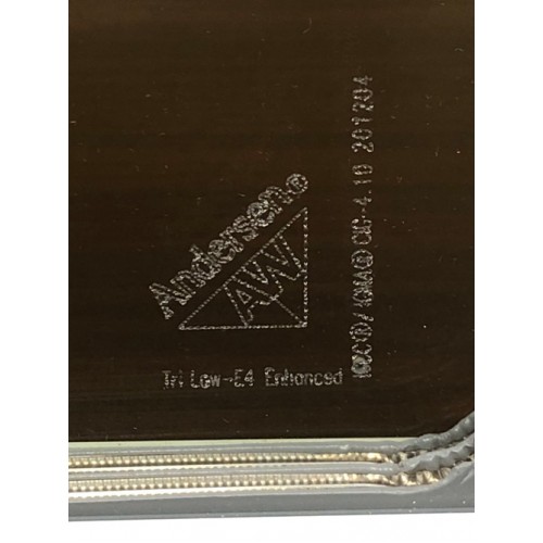 Renewal by Andersen® window sample with stainless steel spacer and the Andersen® bug stamped in the bottom corner. 7” x 7” sample wrapped in white frame.