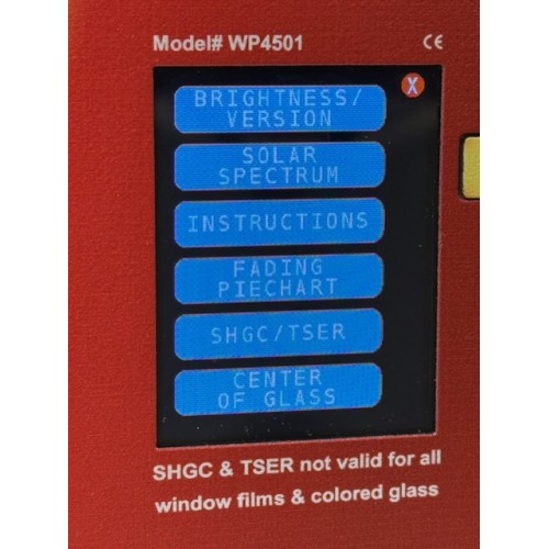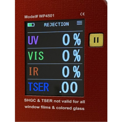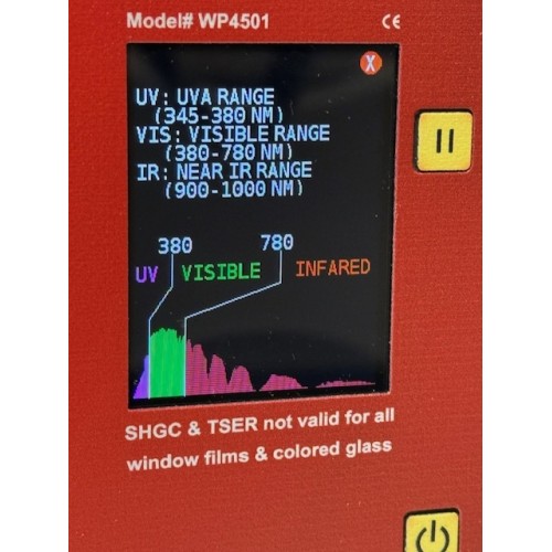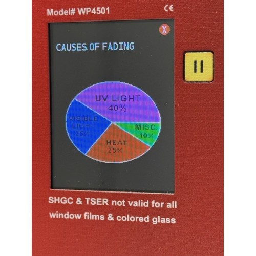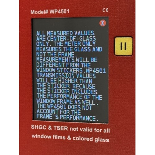 Test the energy performance of installed windows. The Window Energy Profiler has a large enough opening to fit over the window sash of an installed window. The WP4501 displays four real-time measurements of windows: the estimated SHGC value along with the UV, Visible Light, and Infrared Transmission values.