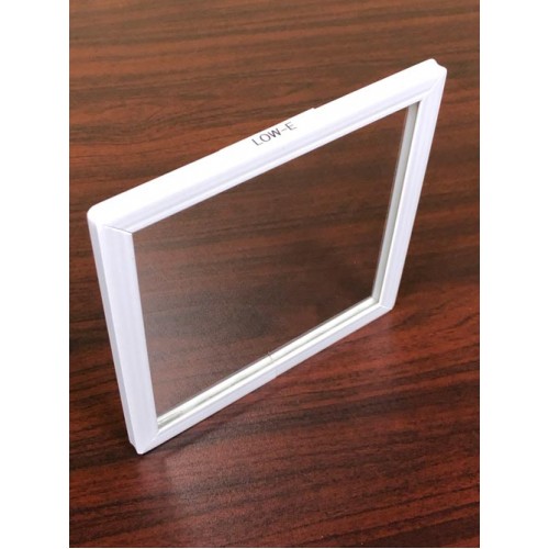 If you want to customize the glass in your Sales Kit, this is a single piece of Hard Coat Low-E glass. The glass is 7 inches square and 1/8 inch thick. The sample includes a white vinyl wrap on the perimeter to protect the edges from chipping or cracking during your presentations. With the white vinyl wrap included, the final dimensions of the window are 7.25 x 7.25 x 0.42 inches. The sample can be custom ordered with the white vinyl wrap excluded. This sample is great for conducting demonstrations to educate customers about how Low-E coatings function in the cold winter months by reflecting the cold temperatures back outside while holding the heat inside.