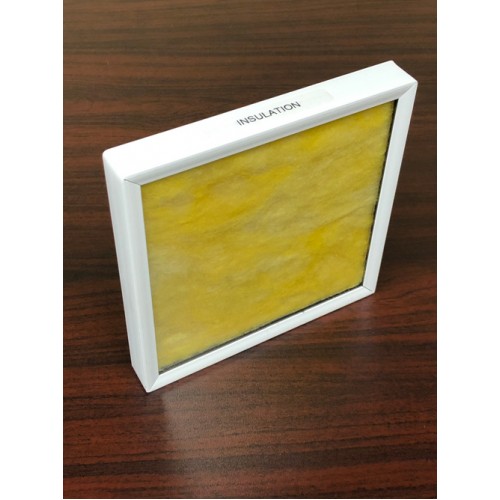 Sometimes in sales presentations, it is fun to illustrate to a customer what a perfect window might look like from a thermal performance standpoint. To illustrate this point, many sales team members will use this double-pane window filled with insulation to bring that point to life. The standard window is constructed of 1/8" glass with a 1/2" spacer. Other options may be available. With the protective white vinyl wrap on the perimeter, the resulting window dimensions are 7.2 x 7.2 x 0.95 inches.
